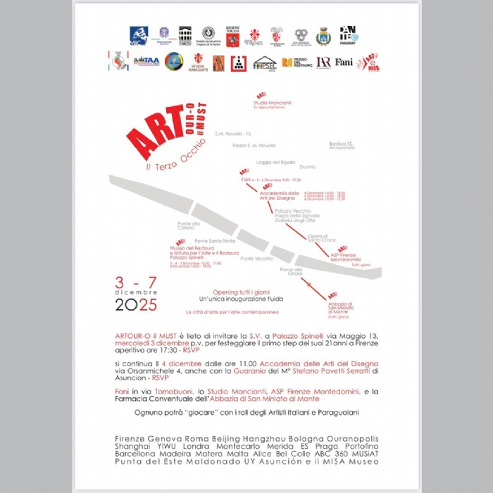 All'interno di Palazzo Spinelli a Firenze, Tiziana Leopizzi cura la mostra ARTOUR-O II MUST. Espongono gli artisti presenti ad Asuncion Paraguay con le opere roll.
